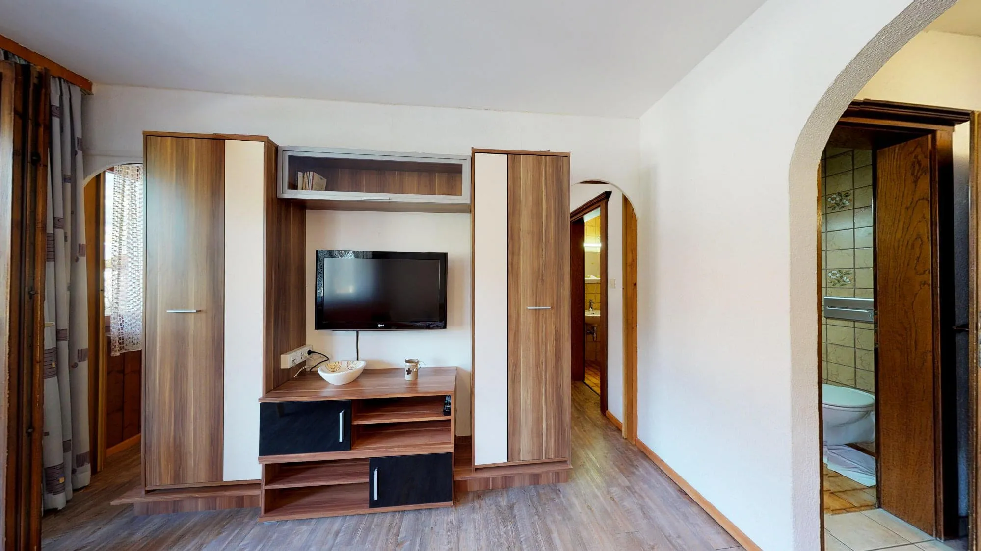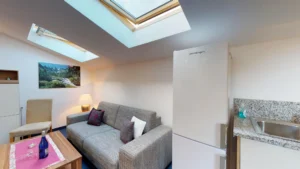 W skład apartamentu wchodzi przestronny pokój gościnny z Sat-TV oraz częścią sypialną z dużym, dwuosobowym łóżkiem. W dalszej części znajduje się w pełni wyposażony aneks kuchenny (patrz tabela), a także łazienka z WC. Do dyspozycji gości jest także kabina podczerwieni.