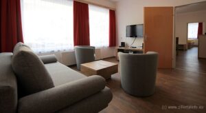 W dalszej części znajduje się duży pokój gościnny z Sat-TV, oraz aneks kuchenny wyposażony w (patrz tabela); w apartamencie również łazienka i oraz toaleta.